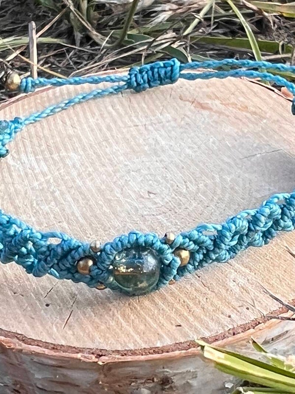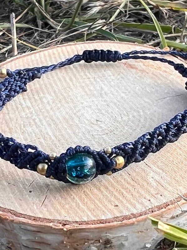Chaque bracelet de la collection Éclats d’Océan est entièrement noué à la main en micro-macramé, autour d’une perle en verre aux reflets profonds.