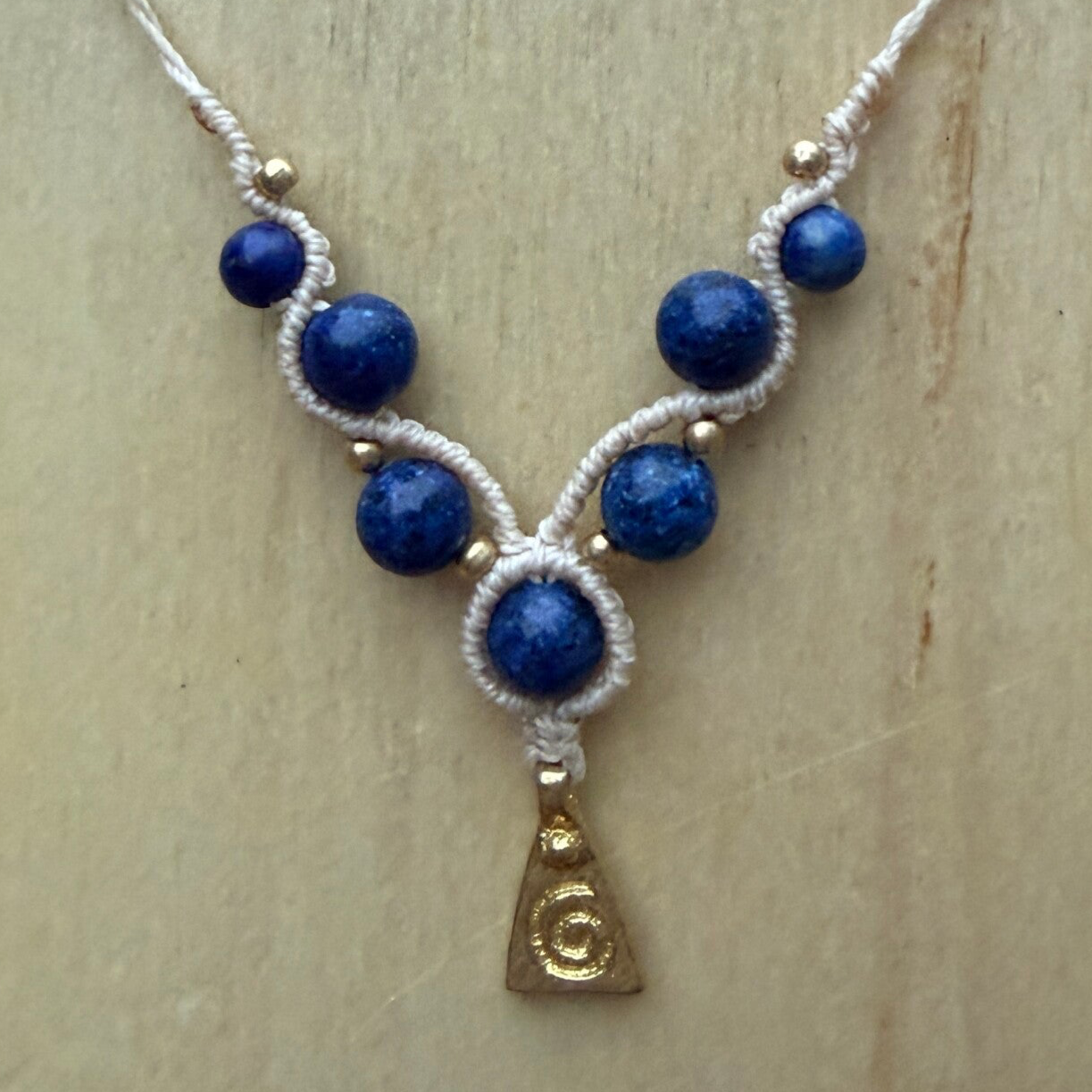 Collier en micro-macramé tissé main, orné de perles de lapis-lazuli et de perles en laiton.
