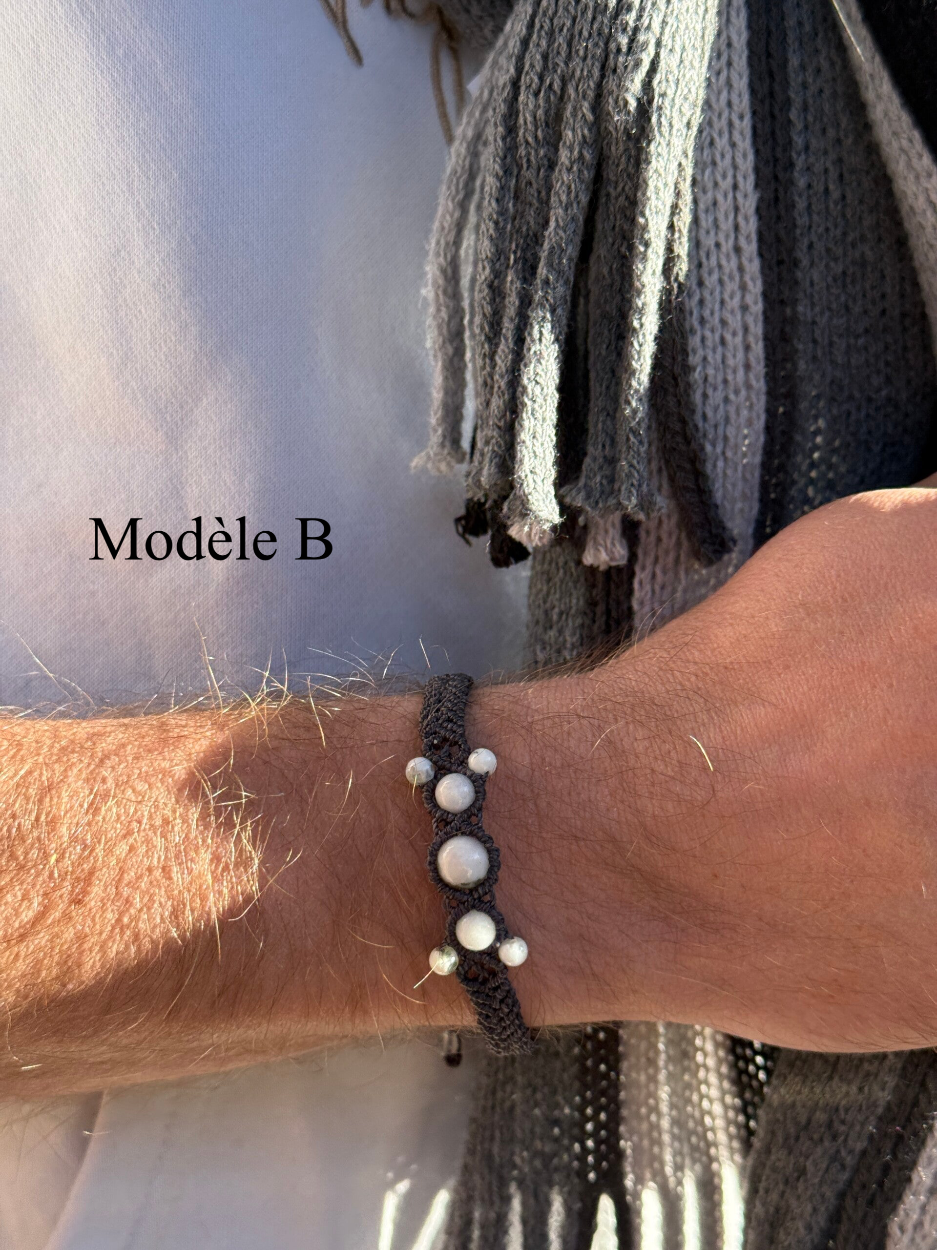 Tissés à la main, ces bracelets en micro-macramé accueillent des perles naturelles pierre d’équilibre et de lien.