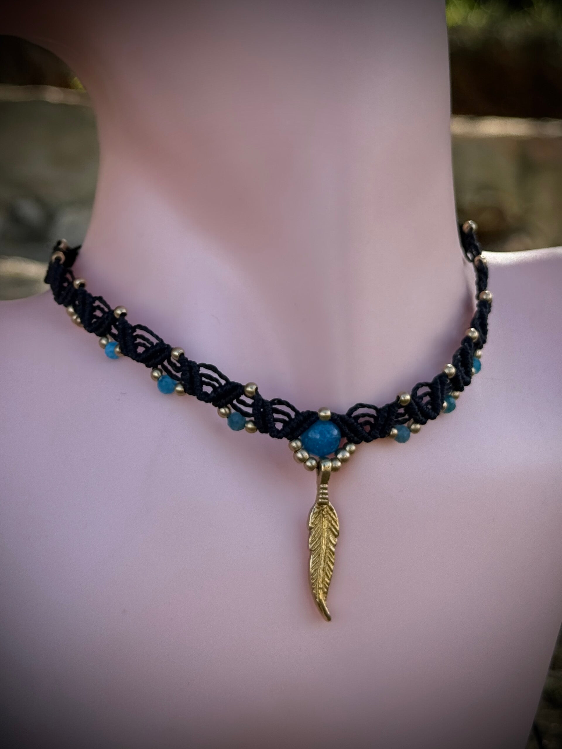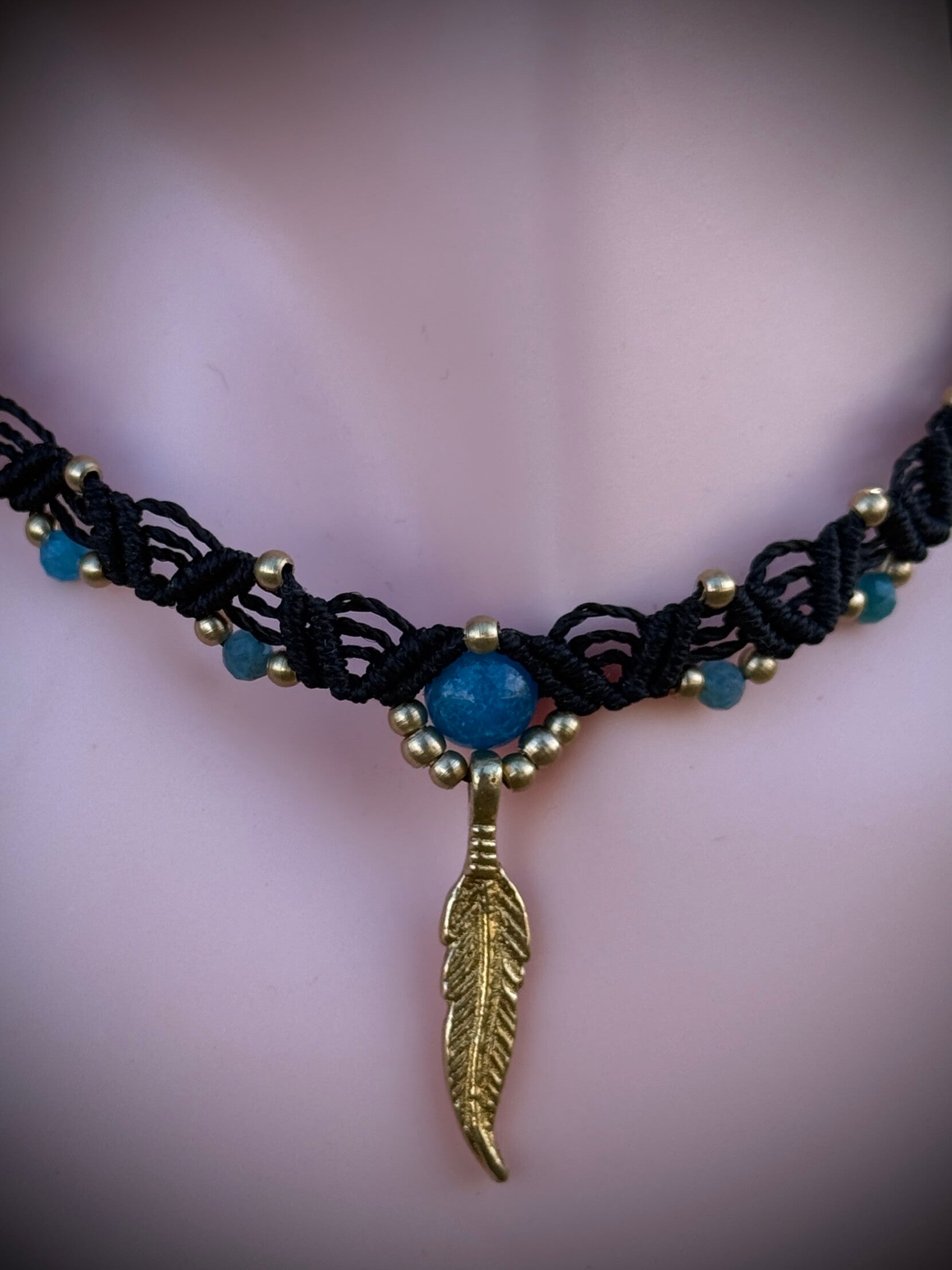 Collier en micro-macramé orné d’une apatite naturelle, d'apatites naturelles facettées, de perles et d’une plume en laiton symbole de liberté.