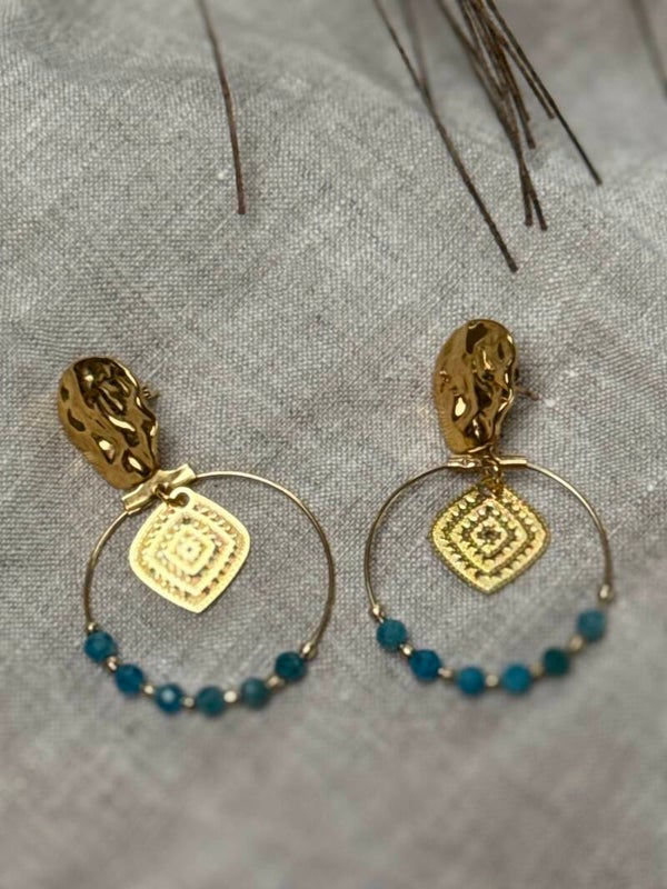 Boucles d’oreilles artisanales alliant modernité et élégance naturelle. Montées sur une puce dorée martelée à l’effet fondu et sculptural, elles s’ornent d’un anneau créole doré sur lequel sont enfilées des perles d’Apatite bleue facettées, alternées de petites perles dorées. En pendentif central, un médaillon carré doré à motif spirale ciselé apporte une touche graphique et sophistiquée.